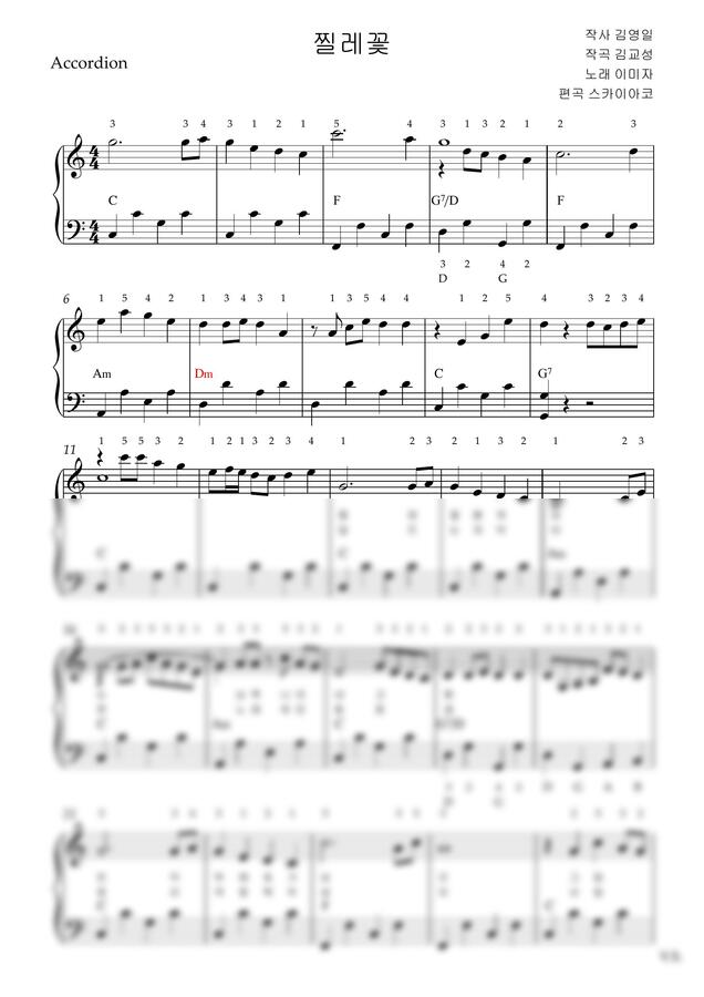 이미자 - 찔레꽃(아코디언악보, 난이도 고급, C key, 손가락번호) by 스카이아코