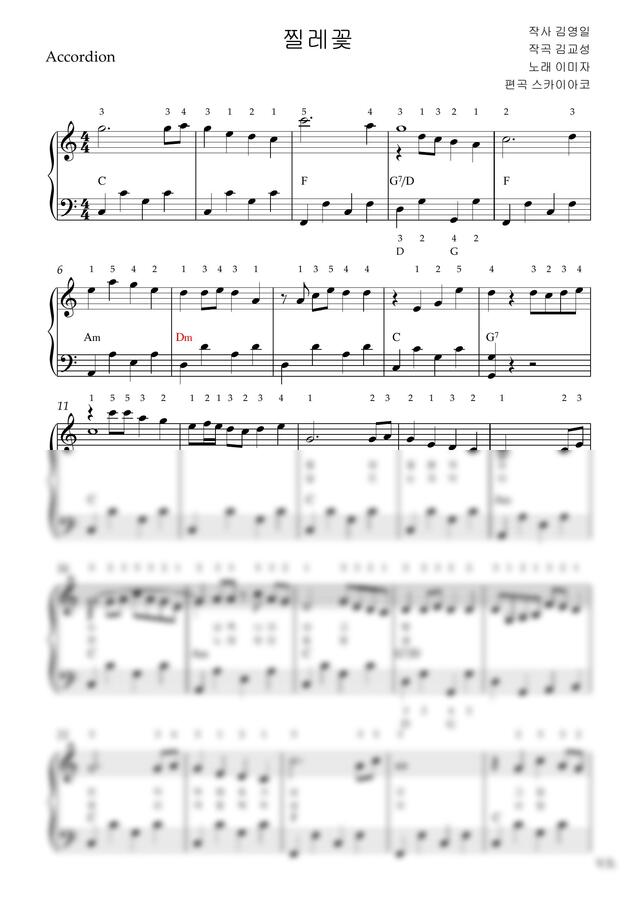 이미자 - 찔레꽃(아코디언악보, 난이도 고급, C key, 손가락번호) by 스카이아코
