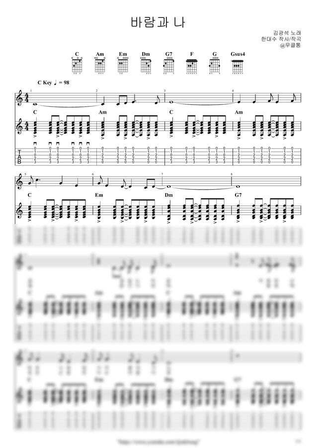 |우클통|의 악보는 오선+타브+가사+운지+코드 등을 잘 기록하고 있습니다.