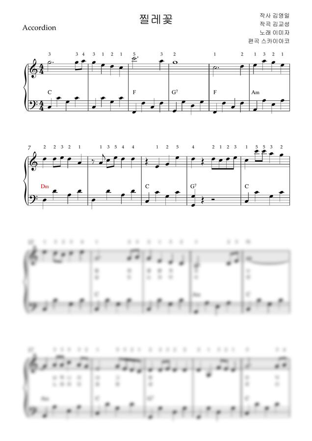 이미자 - 찔레꽃 (아코디언악보, 난이도 중급, 손가락번호) by 스카이아코