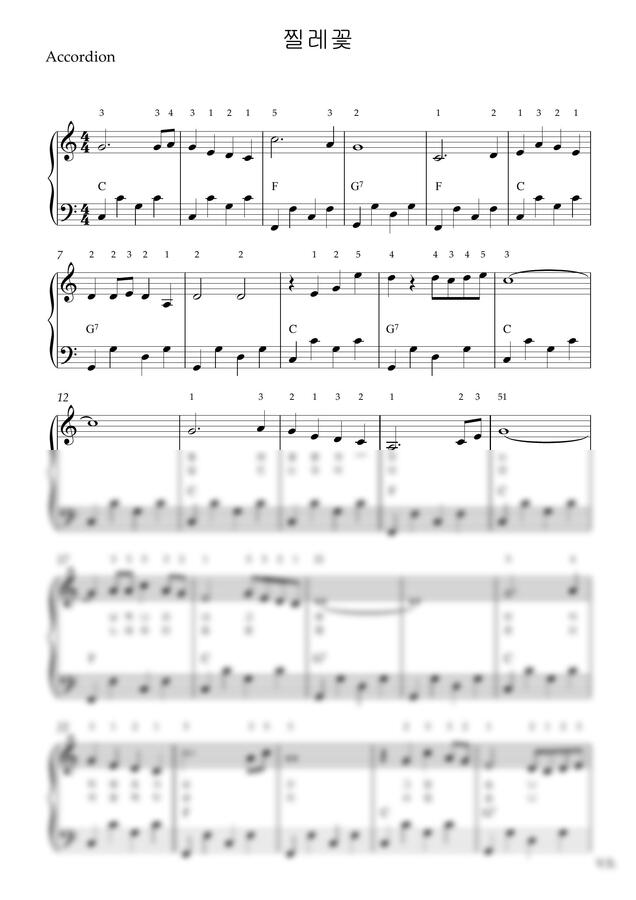 이미자 - 찔레꽃 (아코디언악보, 난이도 초급, 손가락번호) by 스카이아코
