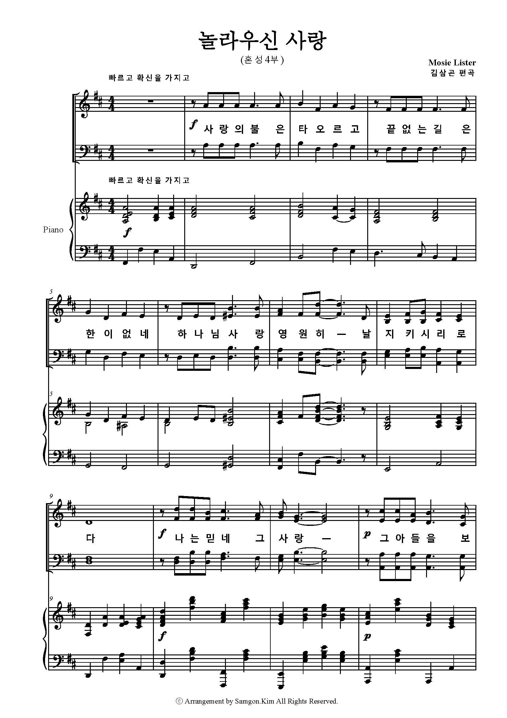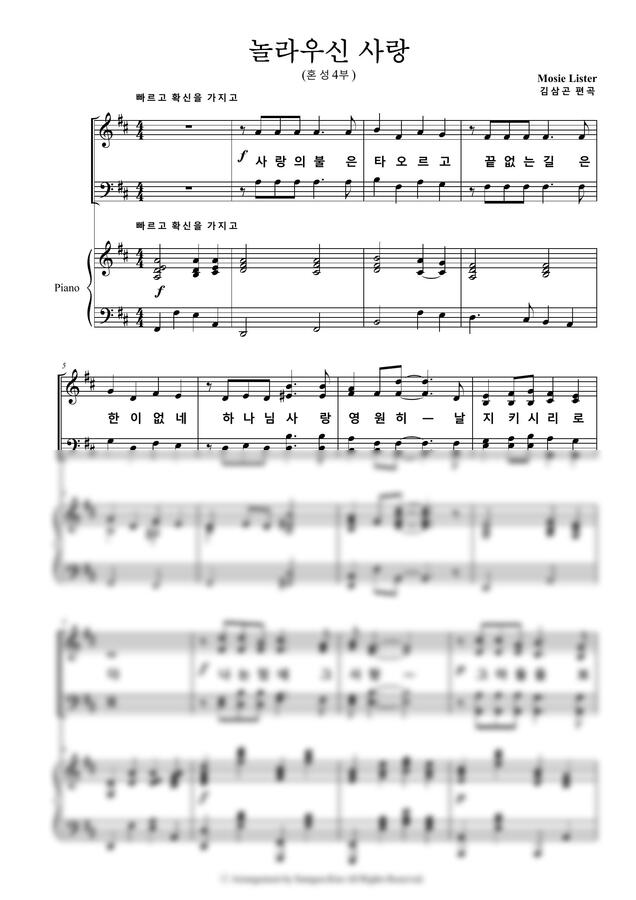곡명: 놀라우신 사랑 (Wonderful Love) 작곡: Mosie Lister 편곡: 김삼곤 (Samgon Kim) 형식: 혼성 4부 합창 (SATB) 및 피아노 반주