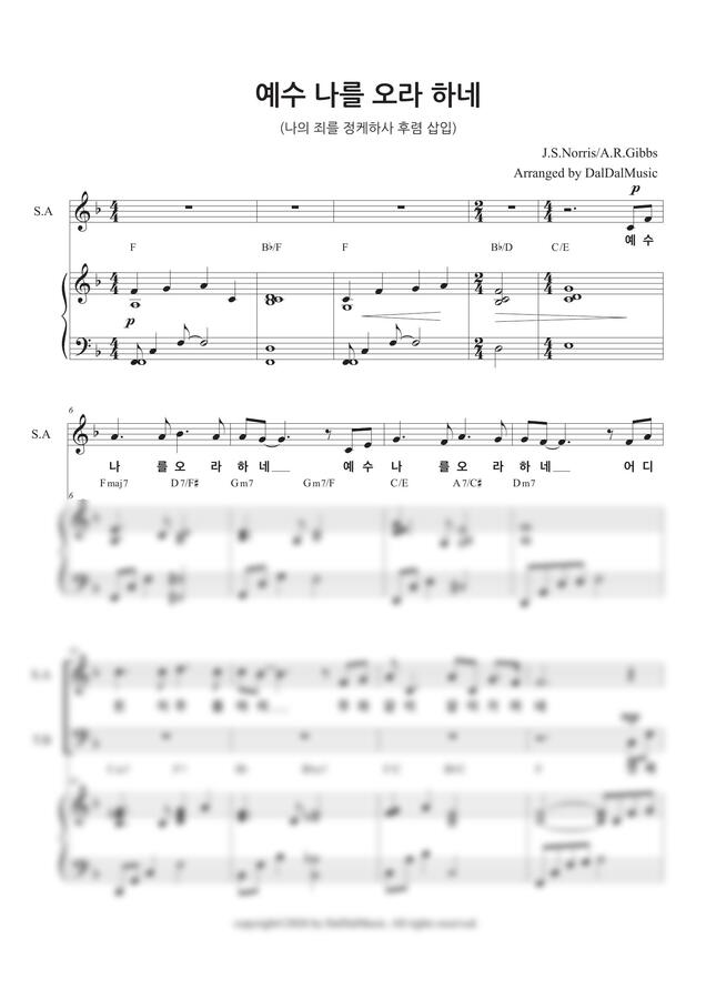 찬송가 <예수 나를 오라 하네>를 성가대 4부로 편곡 하였습니다. 뒷 부분에 찬송가 <나의 죄를 정케 하사>의 후렴만 삽입하였습니다.