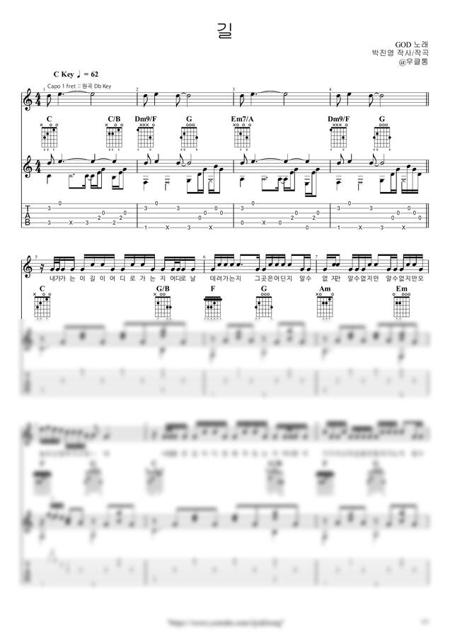 |우클통|의 악보는 오선+타브+가사+운지+코드 등을 잘 기록하고 있습니다.