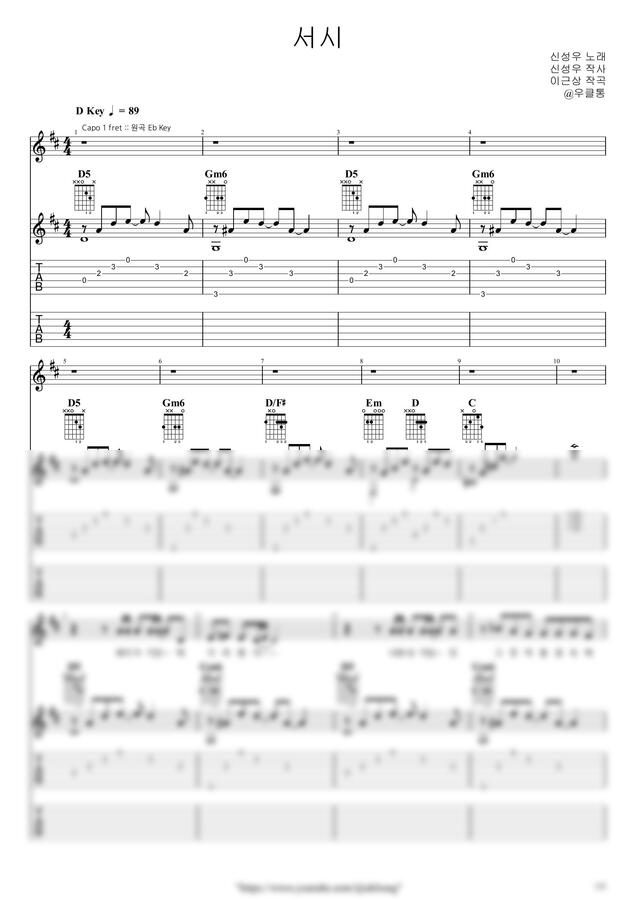 |우클통|의 악보는 오선+타브+가사+운지+코드 등을 잘 기록하고 있습니다.