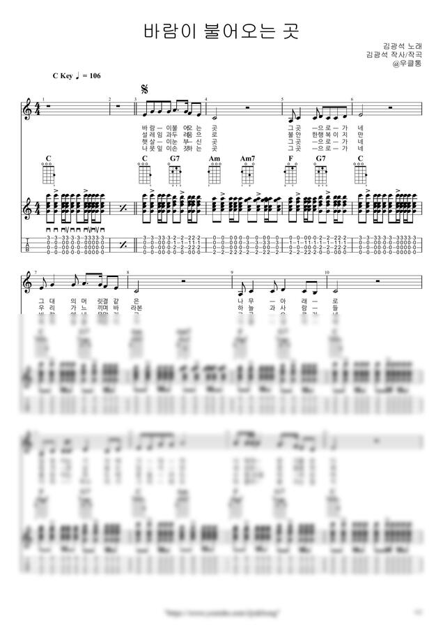 |우클통|의 악보는 오선+타브+가사+운지+코드 등을 잘 기록하고 있습니다.