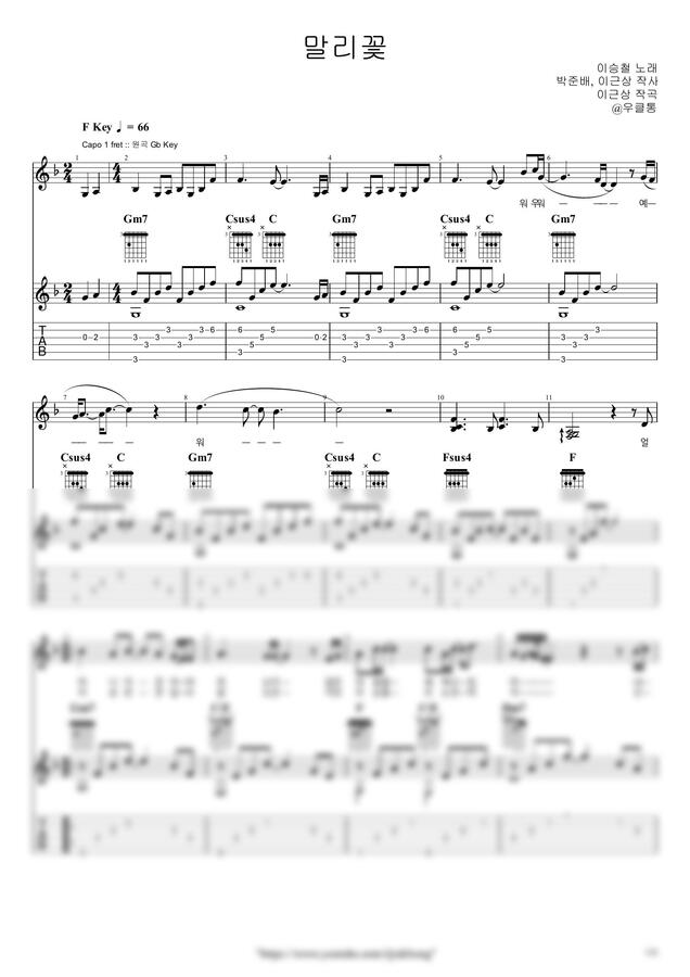 |우클통|의 악보는 오선+타브+가사+운지+코드 등을 잘 기록하고 있습니다.