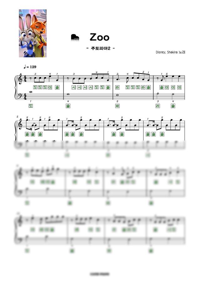 Shakira - Zoo (주토피아 2 OST) (다장조 계이름 악보, 전체 악보 + 짧은 악보) by Lucid Piano1