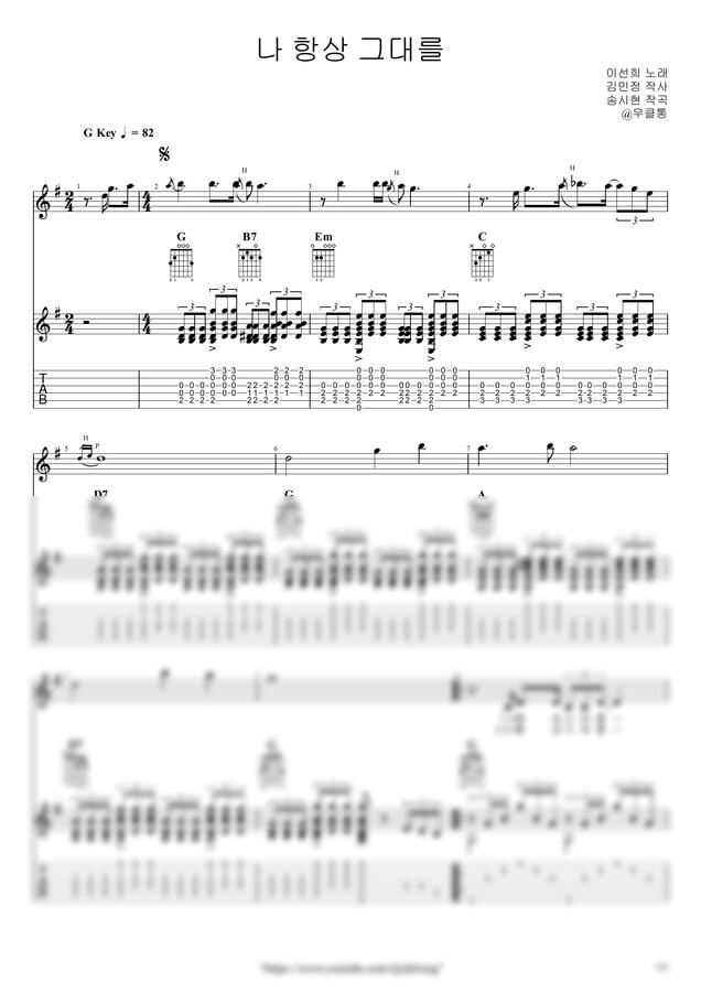 |우클통|의 악보는 오선+타브+가사+운지+코드 등을 잘 기록하고 있습니다.