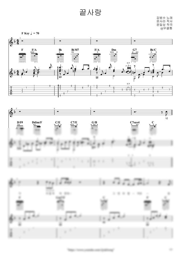 |우클통|의 악보는 오선+타브+가사+운지+코드 등을 잘 기록하고 있습니다.