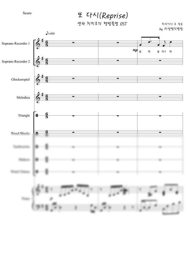 히사이시 조 - 또 다시(Reprise/센과 치히로의 행방불명 OST/10개 악기 합주악보/난이도 보통/서정적이다가 발랄하고 웅장해지는 편곡) (G key) by 미설쌤의별방0