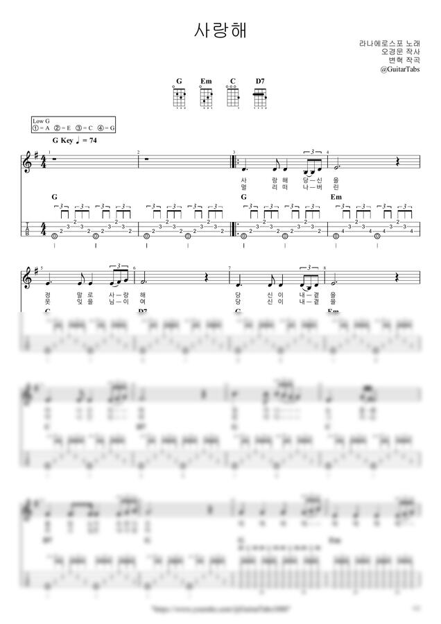 G Key / 2p / 2단(노래+반주) / 5선(Staff) / 타브(TAB) / 가사(Lyrics) / 코드(Chords)