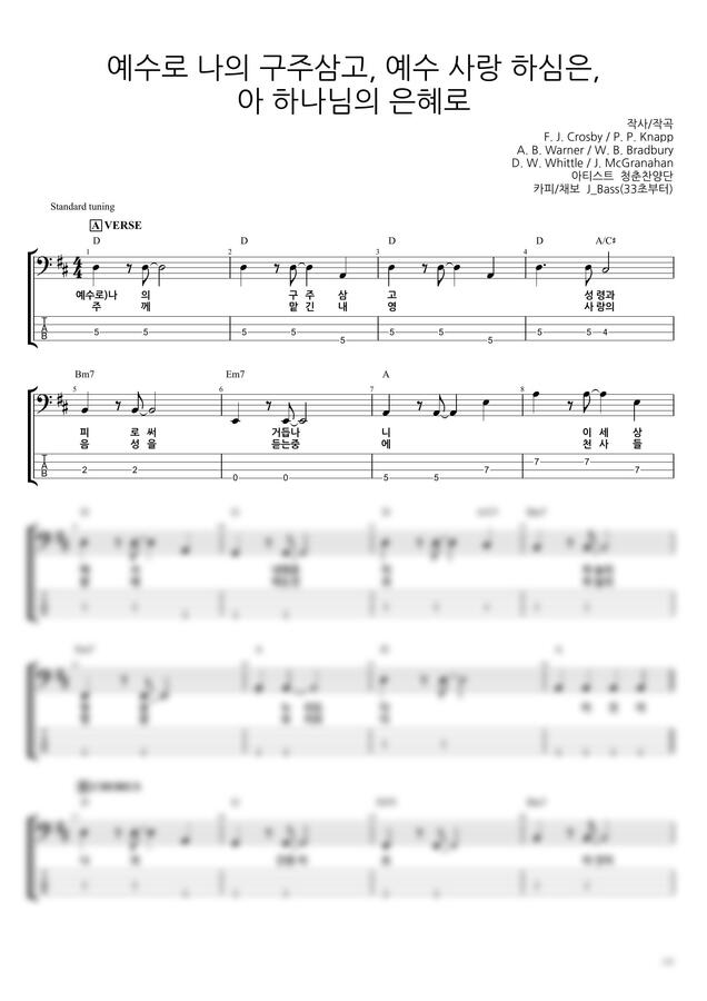 청춘찬양단의 찬양 3곡 메들리 "예수로 나의 구주삼고, 예수 사랑하심은, 아 하나님의 은혜로" 베이스기타 쉬운버전 악보입니다.