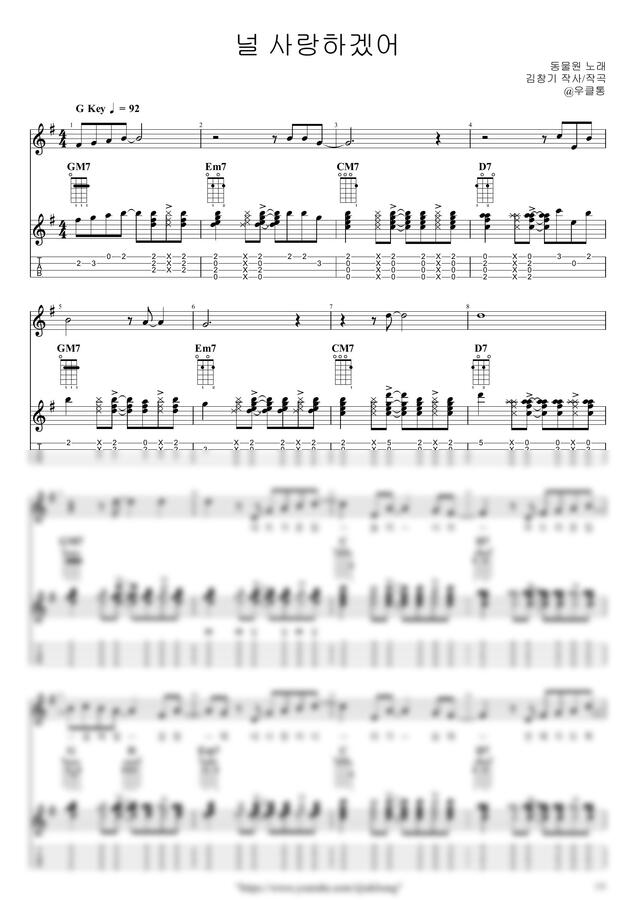|우클통|의 악보는 오선+타브+가사+운지+코드 등을 잘 기록하고 있습니다.