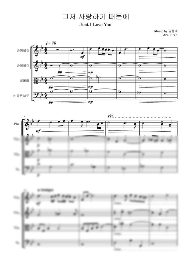 김용호 곡, 그저 사랑하기 때문에 를 현악 4중주로 편곡한 악보입니다