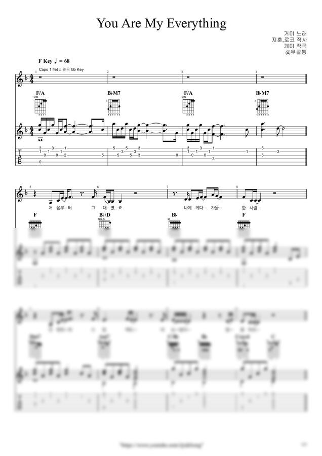|우클통|의 악보는 오선+타브+가사+운지+코드 등을 잘 기록하고 있습니다.