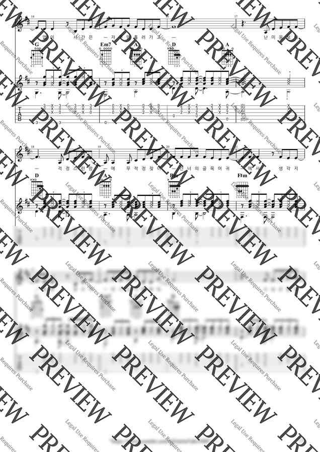 프리미엄 악보는 오선, 타브, 코드, 운지 등 생략된 기보없이 모든 정보를 다 보여주며, 코드는 악보내에 배치하고 다이어그램의 크기도 키워 직관성을 높이고, 보표단의 간격은 넓히는 등 연주자의 가시성과 편리성을 최대한 높힌 고급 악보입니다.