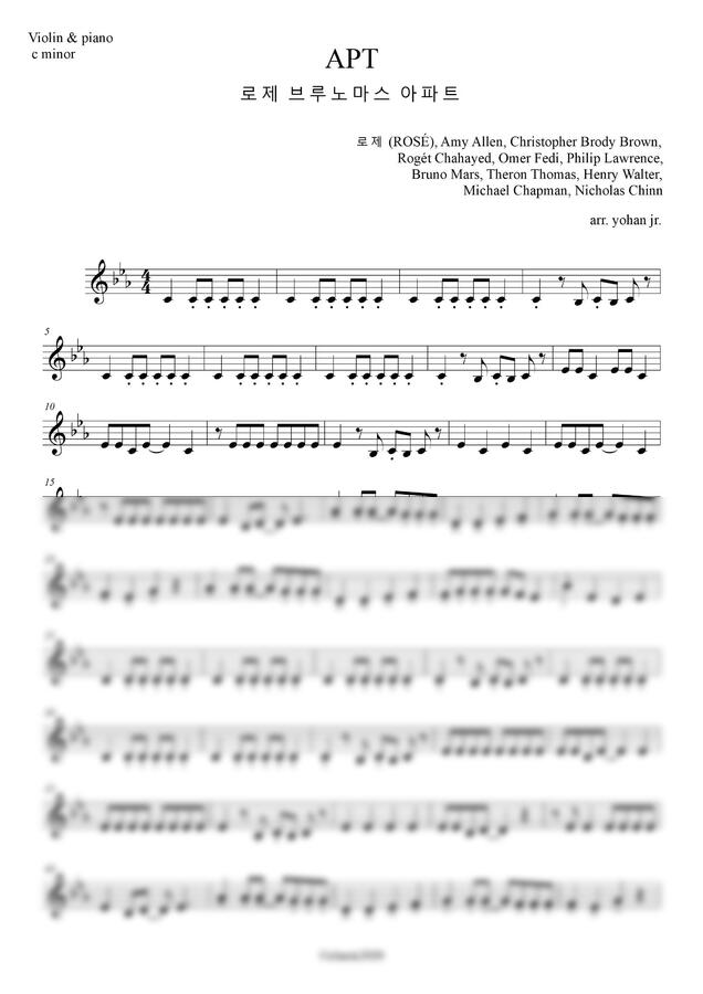 로제와 브루노 마스의 "APT'를 바이올린과 피아노로 연주할 수 있도록 편곡한 악보입니다.