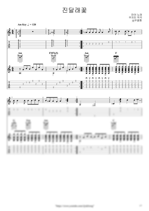 |우클통|의 악보는 오선+타브+가사+운지+코드 등을 잘 기록하고 있습니다.