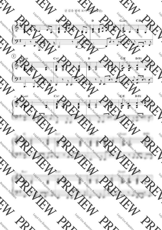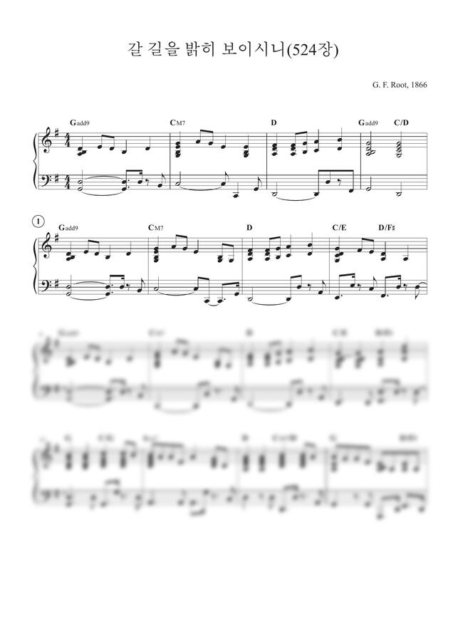 갈 길을 밝히 보이시니 반주 악보입니다. 첫 번째는 멜로디를 포함해서 반주했습니다. 2절에서는 기본적인 리듬 패턴을 적용해서 반주했습니다. 3절은 조금 밴드적인 느낌을 주기 위해 왼손과 오른손에서 리듬의 변화를 시도해 보았습니다. 악보는 아래 링크를 통해 구매하실 수 있습니다.