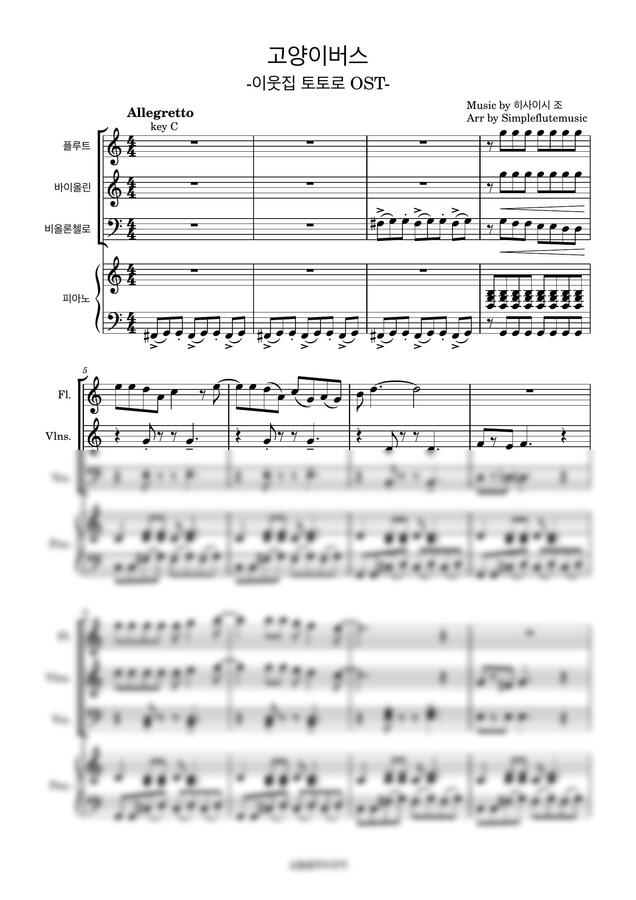 이웃집 토토로 OST - 고양이버스-[플루트][바이올린][첼로][피아노][성인취미연주곡]