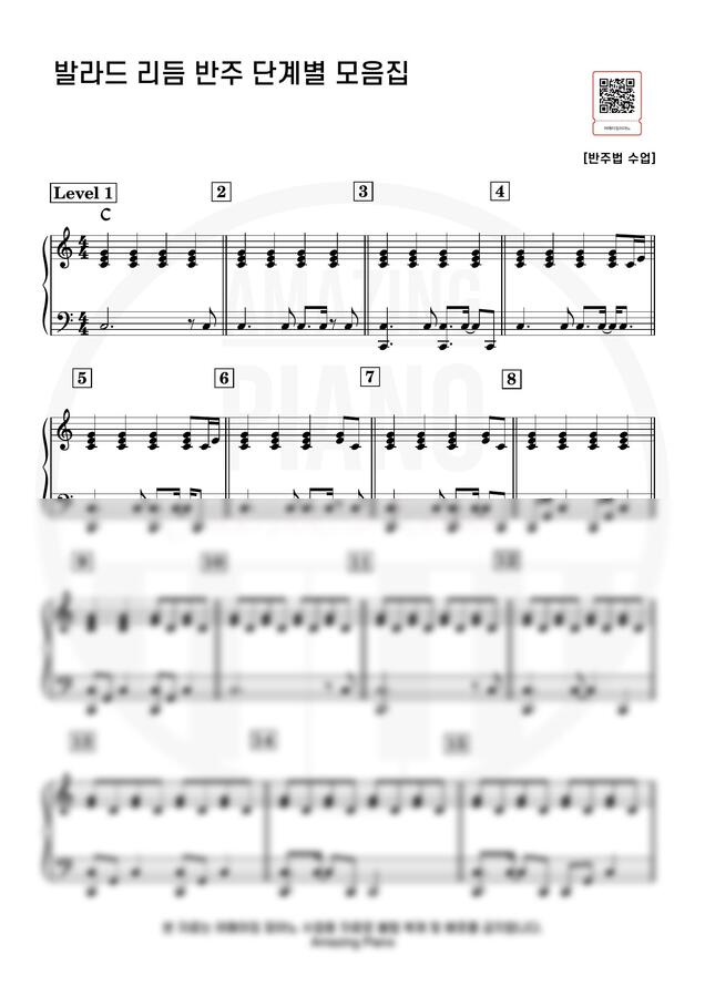 본 악보는 코드 반주 독학을 위한 발라드 리듬 반주 모음집이며, C key 다이어 토닉 코드에 발라드 리듬 반주 1 ~ 15단계를 적용해 트레이닝 연습 하실 수 있도록 제작한 악보입니다.