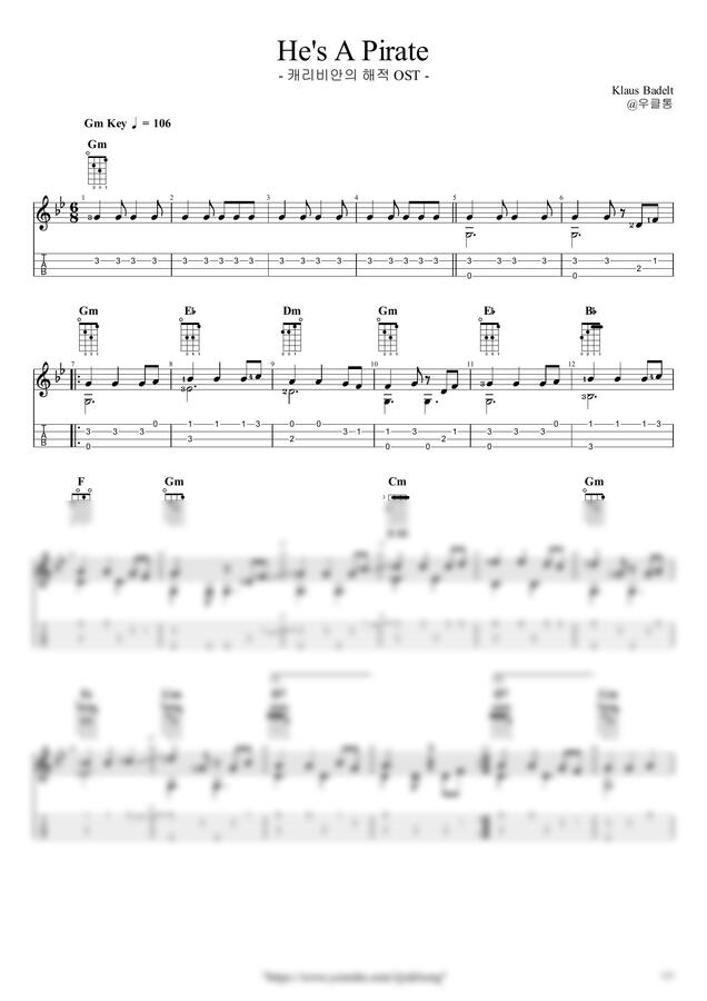 |우클통|의 악보는 오선+타브+가사+운지+코드 등을 잘 기록하고 있습니다.