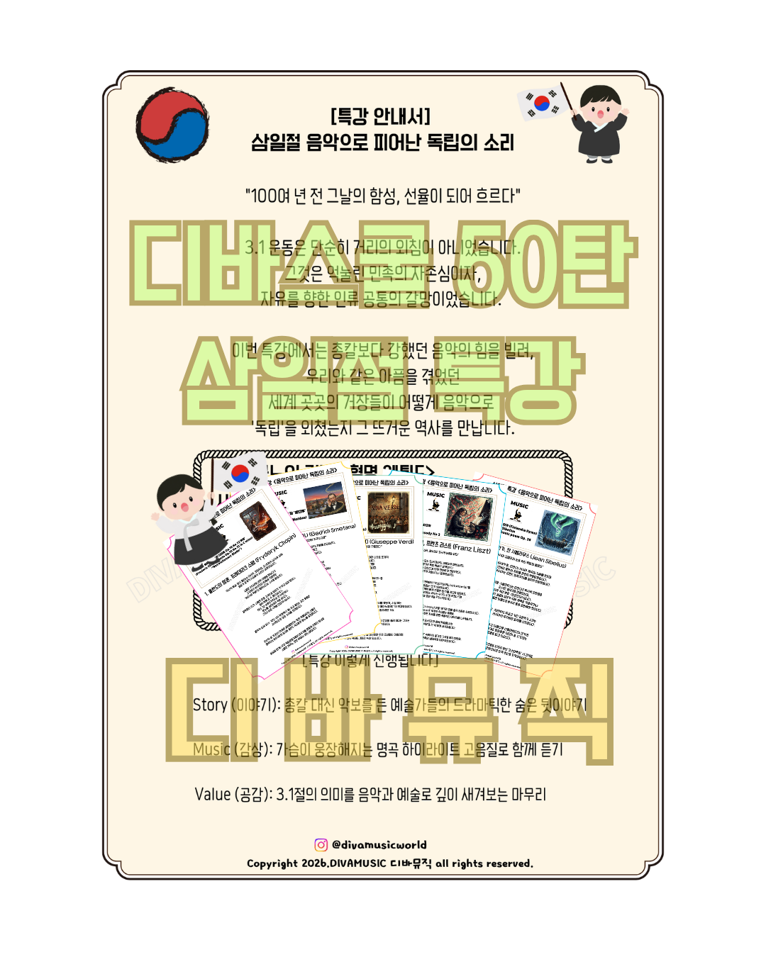 이번 디바스쿨 50탄 삼일절 특강에서는 총칼보다 강했던 음악의 힘을 빌려,