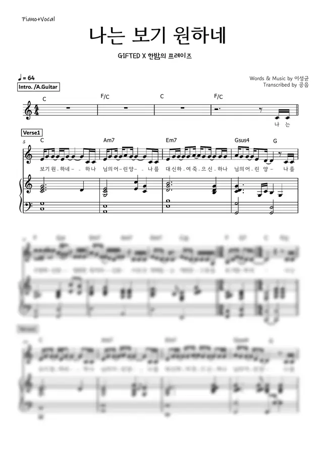 처음 1절은 어쿠스틱기타만 나옵니다. 이 부분은 악보를 생략했고, 1절 반복부터 건반 시작입니다.