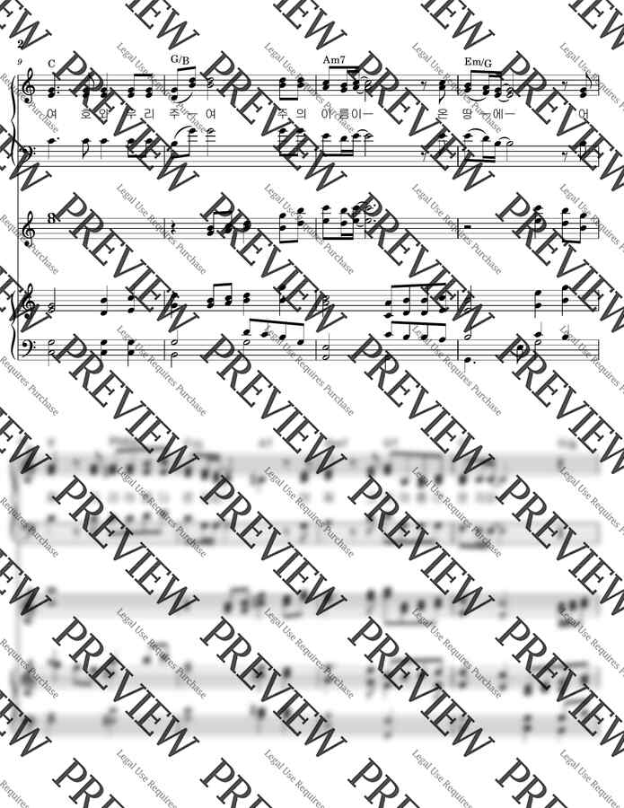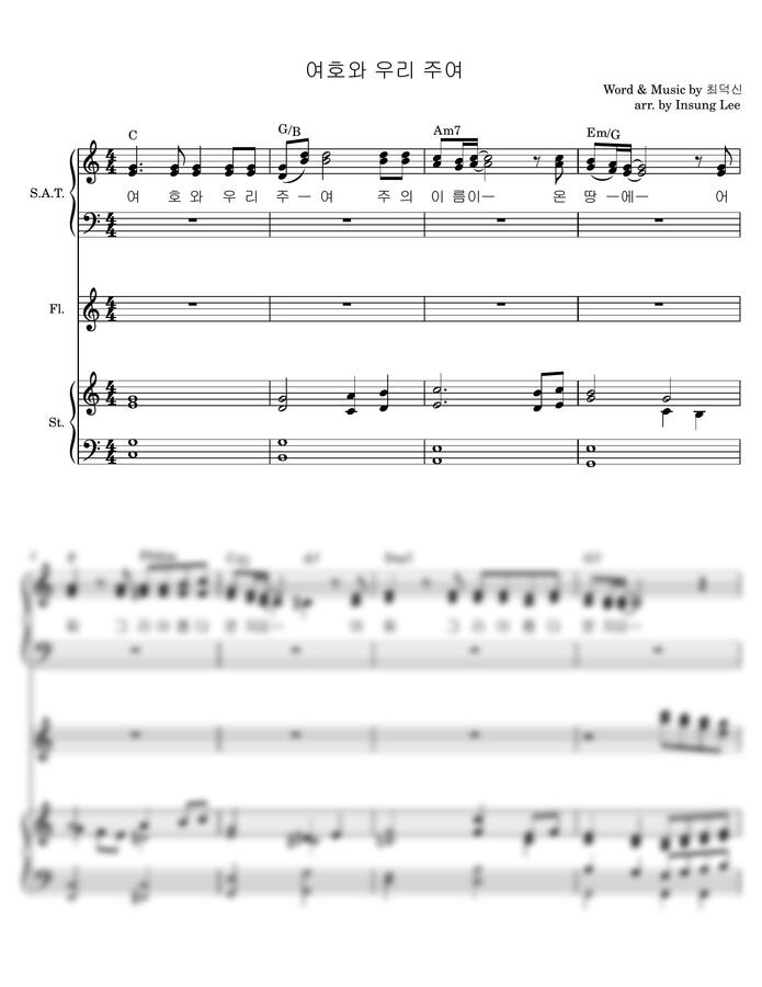 최덕신 <여호와 우리 주여> C key 3성합창+스트링(바이올린1,2/첼로1,2)+플룻(1,2) 악보입니다.