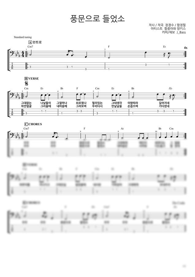 함중아의 "풍문으로 들었소" 베이스기타 쉬운버전 악보입니다.