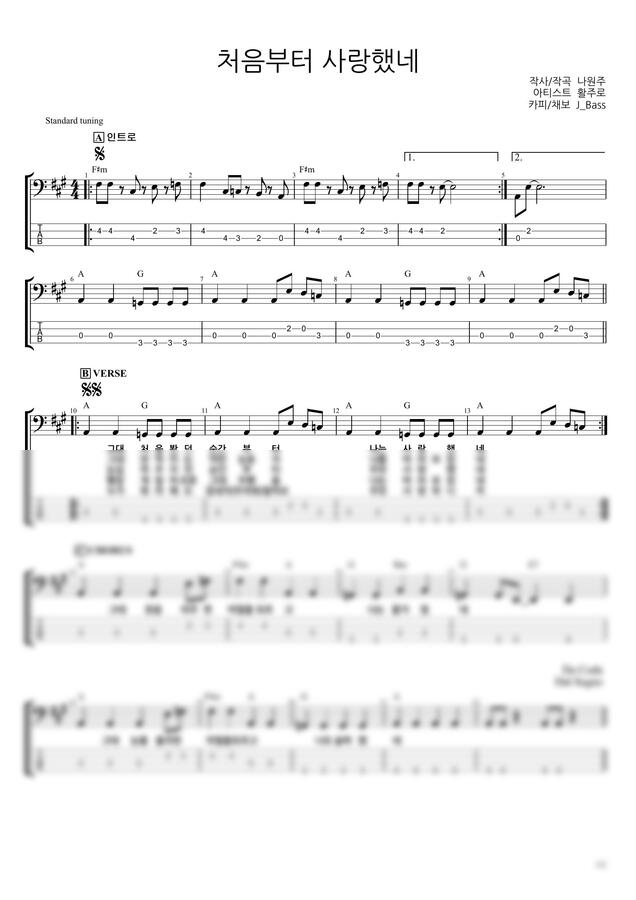 활주로의 "처음부터 사랑했네" 베이스기타 쉬운버전 악보입니다.