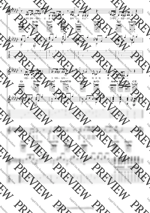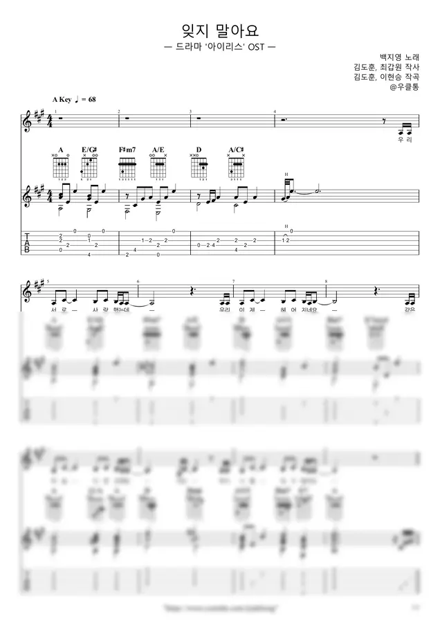 |우클통|의 악보는 오선+타브+가사+운지+코드 등을 잘 기록하고 있습니다.