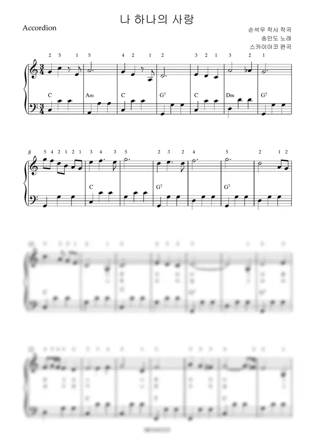 송민도 - 나 하나의 사랑 (아코디언악보, 난이도 중급, 손가락번호) by 스카이아