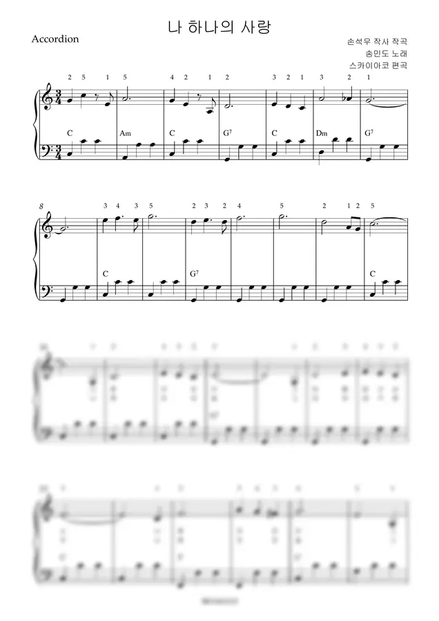 송민도 - 나 하나의 사랑 (아코디언악보, 난이도 초급, 손가락번호) by 스카이아코