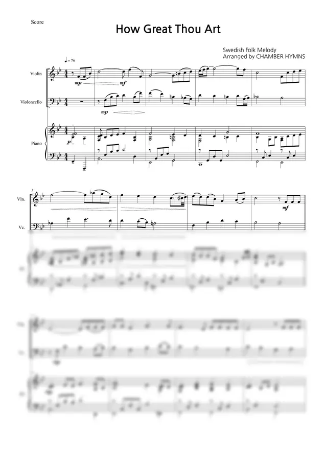 How Great Thou Art is one of the most well-known hymns in Christian worship, expressing awe and reverence for the greatness of God through its expansive melodic line and deeply reflective text. In this piano trio arrangement, the hymn melody unfolds within a warm and spacious chamber texture. The arrangement emphasizes lyrical phrasing and balanced dialogue between violin, cello, and piano, allowing the instruments to support and complement one another while maintaining clarity of the original melody. The moderate tempo and transparent ensemble writing make the piece well suited for expressive church performance.