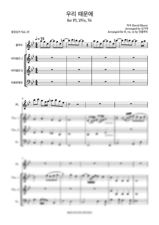 플룻, 2바이올린, 첼로로 편성된 교회 예배 앙상블을 위한 악보입니다.