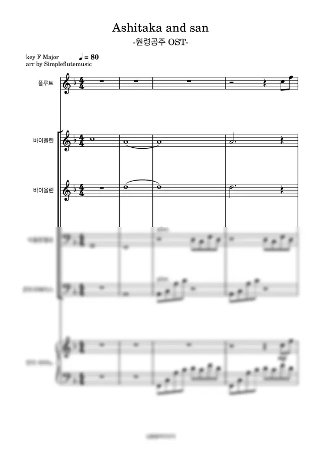 모노노케 히메 OST - 아시타카와 산-[플루트][바이올린][첼로][피아노][쉬운 앙상블]