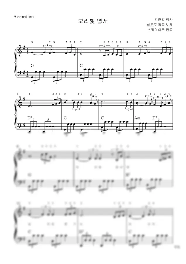 설운도 - 보라빛 엽서 (아코디언악보, 난이도 중급, 손가락번호) by 스카이아코