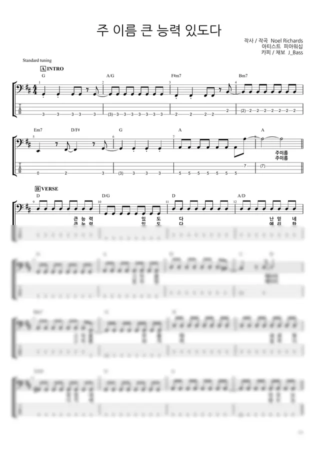 피아워십의 "주 이름 큰 능력 있도다" 쉬운버전 베이스기타 악보입니다.