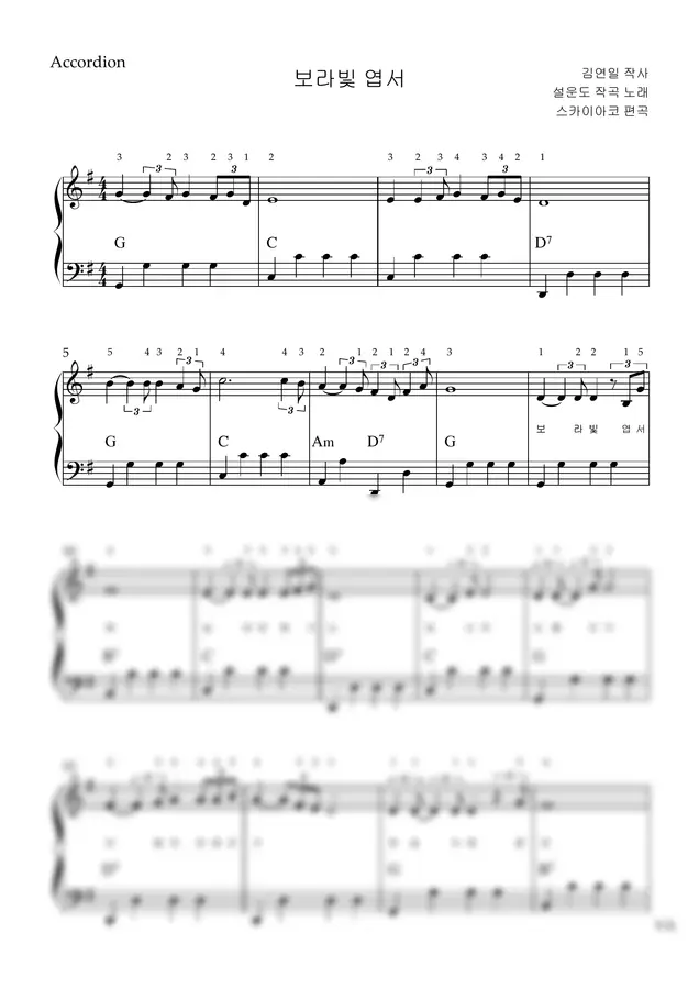 설운도 - 보라빛 엽서 (아코디언악보, 난이도 초급, 손가락번호) by 스카이아코