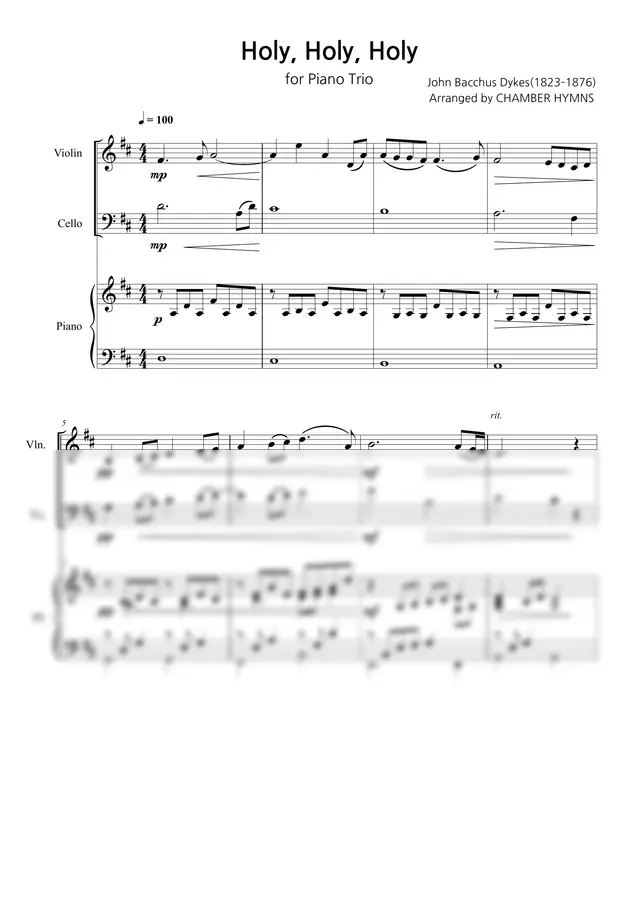 In this piano trio arrangement, the hymn is presented with a clear and dignified character. The melody is supported by a balanced and structured accompaniment, allowing each instrument to contribute to a full yet transparent ensemble sound. The steady tempo and harmonically grounded writing make this arrangement especially effective for formal worship settings.