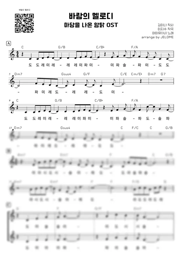 악보 구매하실 때 코드 필요하신 분은 바람의 멜로디(코드O),