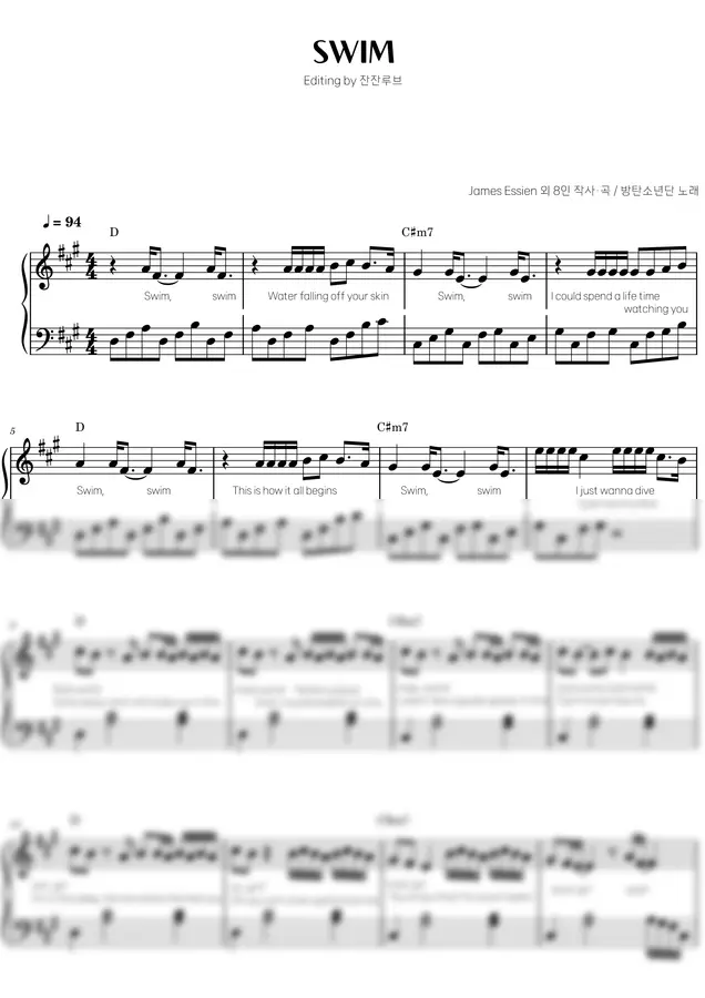 이번 악보는 [BTS 님의 ‘SWIM’] 중급 버전 입니다 🎹