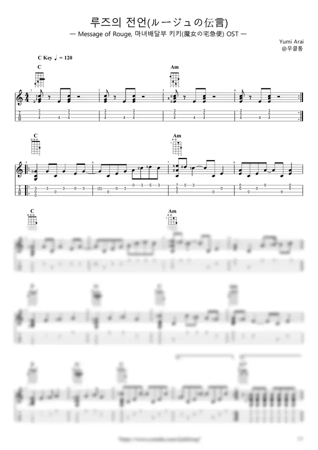 |우클통|의 악보는 오선+타브+가사+운지+코드 등을 잘 기록하고 있습니다.