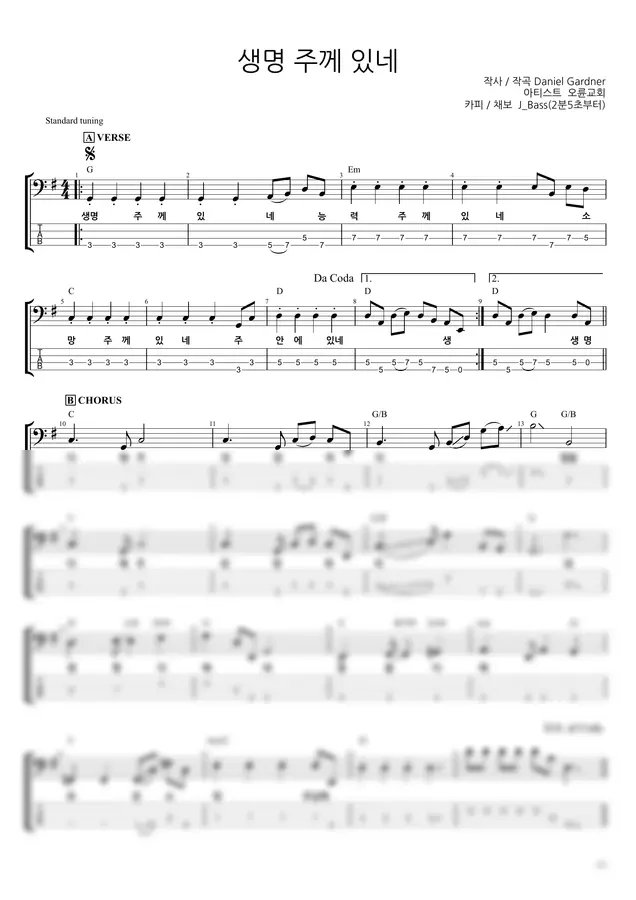 생명 주께 있네(오륜교회) 베이스기타 악보입니다.