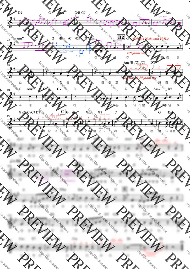 메인 멜로디와 함께 리듬 인,아웃 및 리듬 섹션과 리허설 마크가 표기 되어 있고,