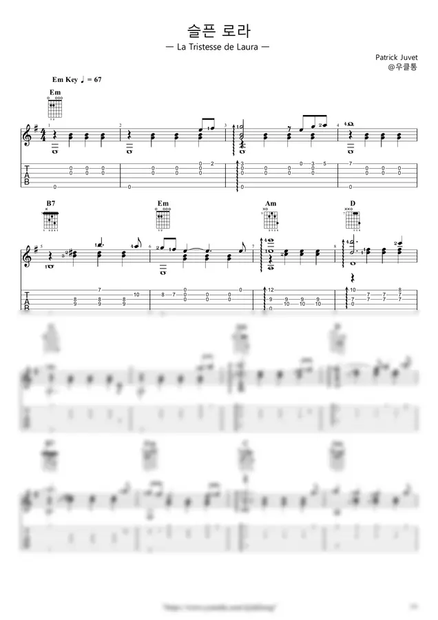 |우클통|의 악보는 오선+타브+가사+운지+코드 등을 잘 기록하고 있습니다.