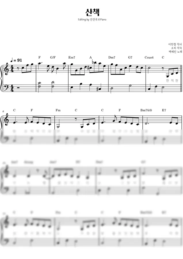 이번 악보는 [백예린 님의 ‘산책’] 초급 버전 입니다 🎹