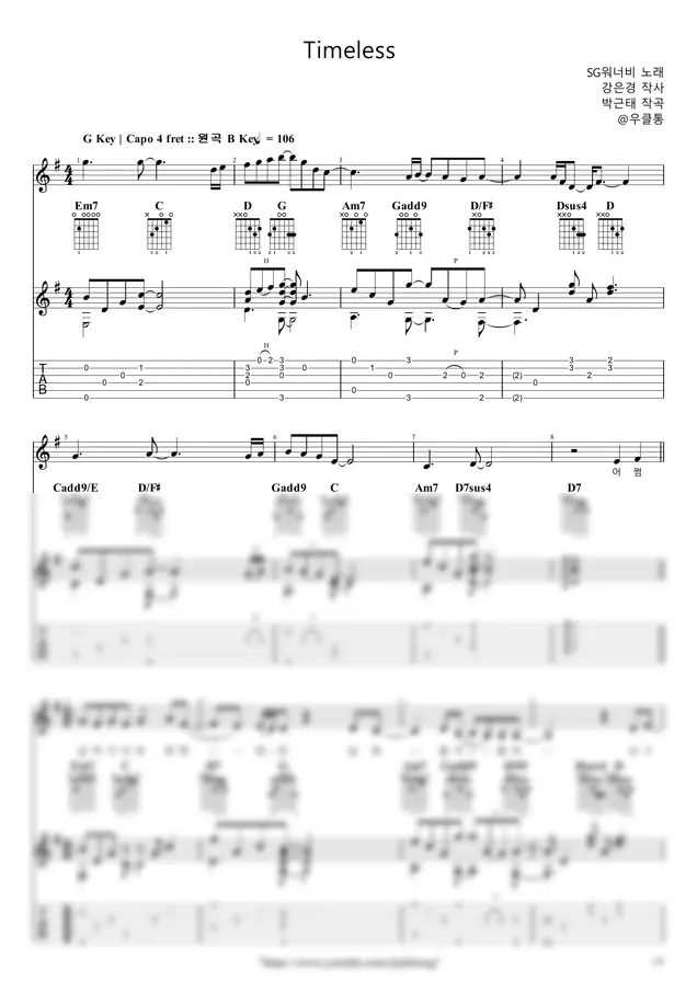 |우클통|의 악보는 오선+타브+가사+운지+코드 등을 잘 기록하고 있습니다.